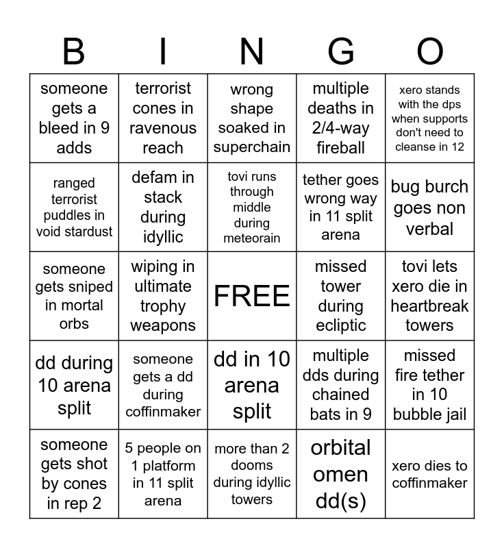 This bingo card has a free space and 24 words: someone gets a dd during coffinmaker, 5 people on 1 platform in 11 split arena, tovi runs through middle during meteorain, someone gets shot by cones in rep 2, xero stands with the dps when supports don't need to cleanse in 12, someone gets a bleed in 9 adds, ranged terrorist puddles in void stardust, terrorist cones in ravenous reach, missed tower during ecliptic, dd in 10 arena split, tether goes wrong way in 11 split arena, someone gets sniped in mortal orbs, multiple dds during chained bats in 9, missed fire tether in 10 bubble jail, defam in stack during idyllic, orbital omen dd(s), tovi lets xero die in heartbreak towers, wrong shape soaked in superchain, bug burch goes non verbal, wiping in ultimate trophy weapons, xero dies to coffinmaker, dd during 10 arena split, multiple deaths in 2/4-way fireball and more than 2 dooms during idyllic towers.