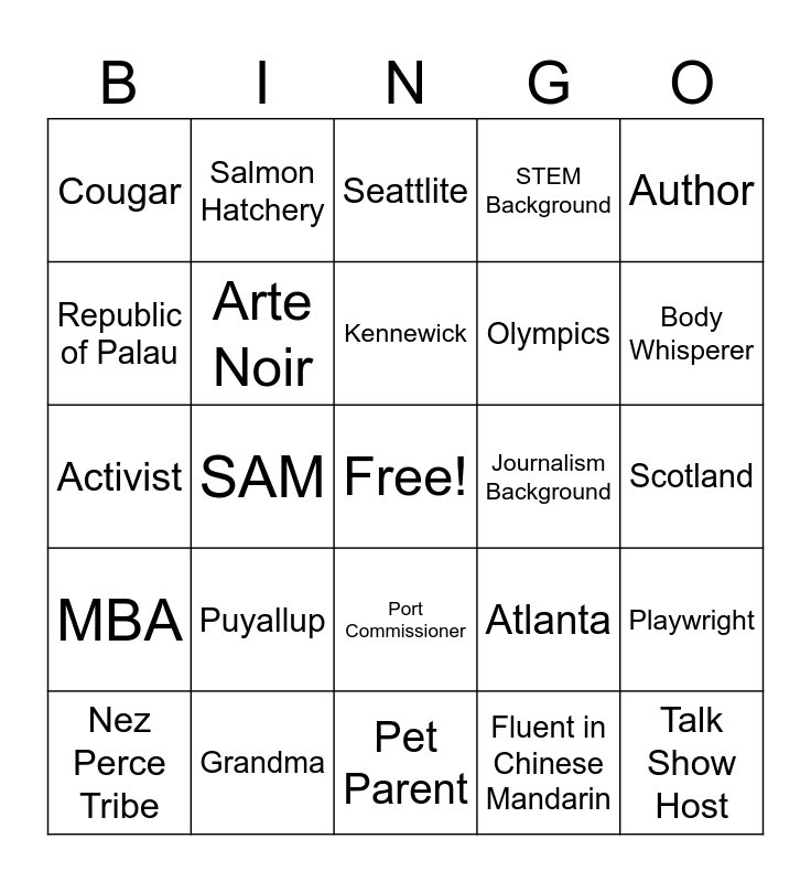 This bingo card has a free space and 24 words: Puyallup, Grandma, Kennewick, Nez Perce Tribe, Author, Cougar, Republic of Palau, Salmon Hatchery, Journalism Background, Port Commissioner, Olympics, Activist, Atlanta, Playwright, Arte Noir, Fluent in Chinese Mandarin, Scotland, Seattlite, Body Whisperer, SAM, Talk Show Host, MBA, STEM Background and Pet Parent.