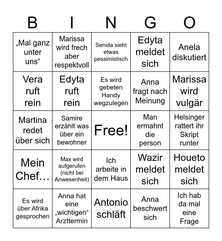 This bingo card has a free space and 49 words: Multikulti, Ich hab da mal eine Frage, Fashola schläft, Antonio schläft, Max wird aufgerufen (nicht bei Anwesenheit), Fashola sagt oh my god, Marissa wird frech aber respektvoll, Anna macht ihre genervt reaktion, Vera ruft rein, Vera meldet sich, Edyta ruft rein, Edyta meldet sich, Houeto meldet sich, Wazir meldet sich, Fingerfertige werden geworfen, Es bricht eine Diskussion aus, Es wird gebeten Handy wegzulegen, Man ermahnt die person, Sie Paul-schalisieren mir zu viel, Anela diskutiert, Samire erzählt was über ein bewohner, Anna beschwert sich, „Mal ganz unter uns“, Anna fragt nach Meinung, Marissa fragt nach meinung, Marissa wird vulgär, Es wird über Afrika gesprochen, „Wir sind eine Münchenstift Klasse“, Ich arbeite in dem Haus, Mein Chef…, Meine Kollegen, Wir haben so einen PE, Irgendwer isst im Unterricht, Marissa geht früher Nach hause, Anna hat eine „wichtigen“ Arzttermin, Vera redet über ernährung, Vera redet über Sport, Vera redet über ihre probleme, Helsinger rattert ihr Skript runter, Frau demirbas disst, Frau Heinzig macht interessante mimik, Frau Krakau Rabe macht diskutiert, Frau westphalen talkt über Lichtenergie, Frau erlauchter ist wird übertrieben streng, Martina redet über sich, Senida sieht etwas pessimistisch, Sanela sagt kleines kind, Frau Fink versucht alles richtig zu sehen and Samire fragt jemanden aus als würde er hellsehen.