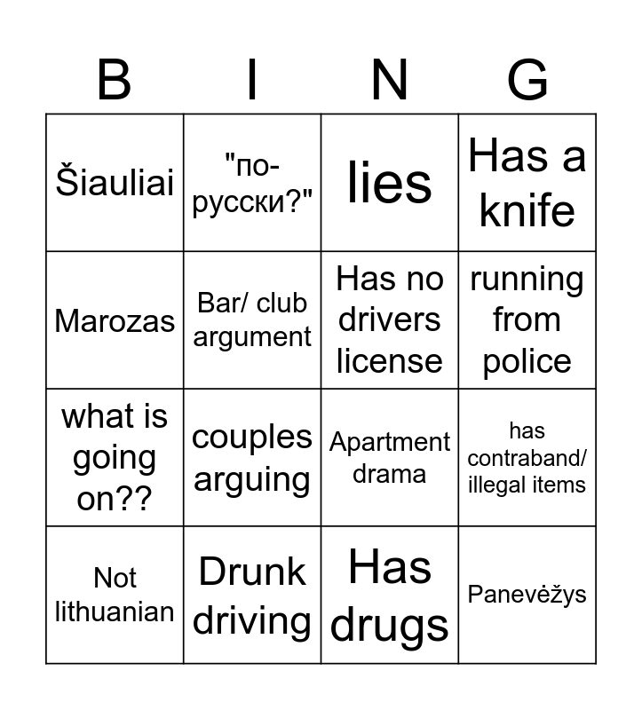 This bingo card has 21 words: Drunk driving, 1,80<, "по-русски?", Fights, Has drugs, Has no drivers license, Šiauliai, lies, Apartment drama, running from police, what is going on??, Has a knife, Panevėžys, Middle of nowhere, Bar/ club argument, Won't open the door, Not lithuanian, couples arguing, Marozas, has contraband/ illegal items and Firemen make an appearance.
