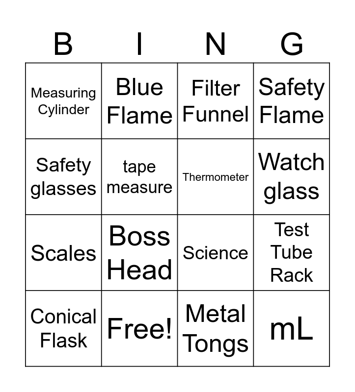 This bingo card has 29 words: Gauze Mat, Test Tube, Test Tube Rack, Tripod, Measuring Cylinder, Filter Funnel, Thermometer, Bunsen Burner, Free!, Heat Proof Mat, Metal Tongs, Conical Flask, Beaker, Evaporating Dish, Boss Head, Clamp, kg, mL, Safety glasses, Science, 30cm ruler, Stop watch, Scales, tape measure, Safety Flame, Blue Flame, Stirring rod, Watch glass and Crucible.