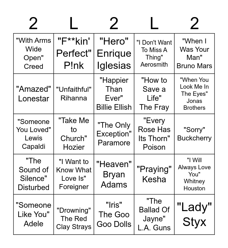 This bingo card has 35 words: "Need You Now" Lady A, "Because of You" Kelly Clarkson, "Mirros" Justin Timberlake, "Unfaithful" Rihanna, "Heaven" Bryan Adams, "I Don't Want To Miss A Thing" Aerosmith, "Amazed" Lonestar, "Total Eclipse of the Heart" Bonnie Tyler, "Happier Than Ever" Billie Ellish, "Seven" Natalie Jane, "Someone You Loved" Lewis Capaldi, "When I Was Your Man" Bruno Mars, "Tattoo" Jordan Sparks, "Home Sweet Home" Mötley Crüe, "With Arms Wide Open" Creed, "Every Rose Has Its Thorn" Poison, "The Ballad Of Jayne" L.A. Guns, "Take Me to Church" Hozier, "The Sound of Silence" Disturbed, "The Only Exception" Paramore, "Praying" Kesha, "Someone Like You" Adele, "I Will Always Love You" Whitney Houston, "Drowning" The Red Clay Strays, "Hero" Enrique Iglesias, "When You Look Me In The Eyes" Jonas Brothers, "Lady" Styx, "Alone" Heart, "How to Save a Life" The Fray, "Sorry" Buckcherry, "Halo" Beyoncé, "Iris" The Goo Goo Dolls, "I Want to Know What Love Is" Foreigner, "F**kin' Perfect" P!nk and "Hurt" Christina Aguilera.