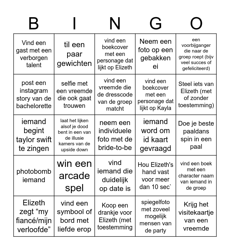 This bingo card has a free space and 40 words: iemand proost op de bruid, iemand begint taylor swift te zingen, vind een vrouw met cowboy laarzen, selfie met een vreemde die ook gaat trouwen, vind een symbool of bord met liefde erop, vind iemand die duidelijk op date is, vind een vreemde die de dresscode van de groep matcht, leg iets ouds, iets nieuws, iets geleend en iets blauws vast in een foto, een voorbijganger die naar de groep roept (bijv veel succes of gefeliciteerd), photobomb iemand, laat het lijken alsof je dood bent in een van de illusie kamers van de upside down, Neem een foto op een gebakken ei, Krijg het visitekaartje van een vreemde, Doe je beste paaldans spin in een paal, iemand word om id kaart gevraagd, win een arcade spel, vind iemand uitgebreid het eten fotograferen voordat ze gaan eten, Vind een gast met een verborgen talent, vind een regenboog, vind een boekcover met een personage dat lijkt op Elizeth, vind een boek met een character naam van iemand in de groep, spiegelfoto met zoveel mogelijk mensen van de party, vind een boekcover met een personage dat lijkt op Kayla, post een instagram story van de bachelorette, Elizeth maakt een zelfmoord grap, vind een gast die al meer dan 10 jaar vrienden is met Elizeth, Vind een gast die een kind heeft, bride-to-be word emotioneel, vind een boekcover met een personage dat lijkt op elizeth, bestel een drankje dat de favoriete kleur is van de bruid, gooi een ballpit bal tegen elizeth's hoofd aan, Elizeth zegt “my fiancé/mijn verloofde”, Laat Elizeth ergens om cringen, Hou Elizeth's hand vast voor meer dan 10 sec`, Steel iets van Elizeth (met of zonder toestemming), Koop een drankje voor Elizeth (met toestemming, Vertel een slechte grap aan Elizeth, als ze lacht mag je deze afstrepen, Neem een selfie in de ballenbak (bonuspunten als de bruid erop staat zonder dat ze het doorheeft), til een paar gewichten and neem een foto met een discobal.