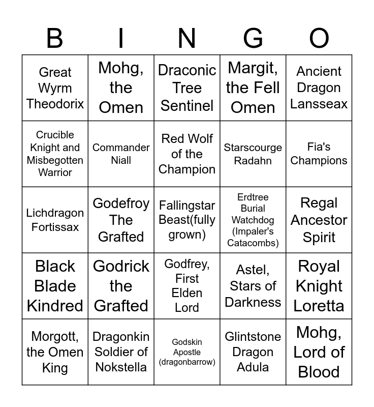This bingo card has a free space and 24 words: Godrick the Grafted, Dragonkin Soldier of Nokstella, Red Wolf of the Champion, Morgott, the Omen King, Ancient Dragon Lansseax, Great Wyrm Theodorix, Crucible Knight and Misbegotten Warrior, Mohg, the Omen, Erdtree Burial Watchdog (Impaler's Catacombs), Godfrey, First Elden Lord, Starscourge Radahn, Lichdragon Fortissax, Astel, Stars of Darkness, Royal Knight Loretta, Commander Niall, Glintstone Dragon Adula, Regal Ancestor Spirit, Draconic Tree Sentinel, Fia's Champions, Godefroy The Grafted, Mohg, Lord of Blood, Black Blade Kindred, Margit, the Fell Omen and Godskin Apostle (dragonbarrow).