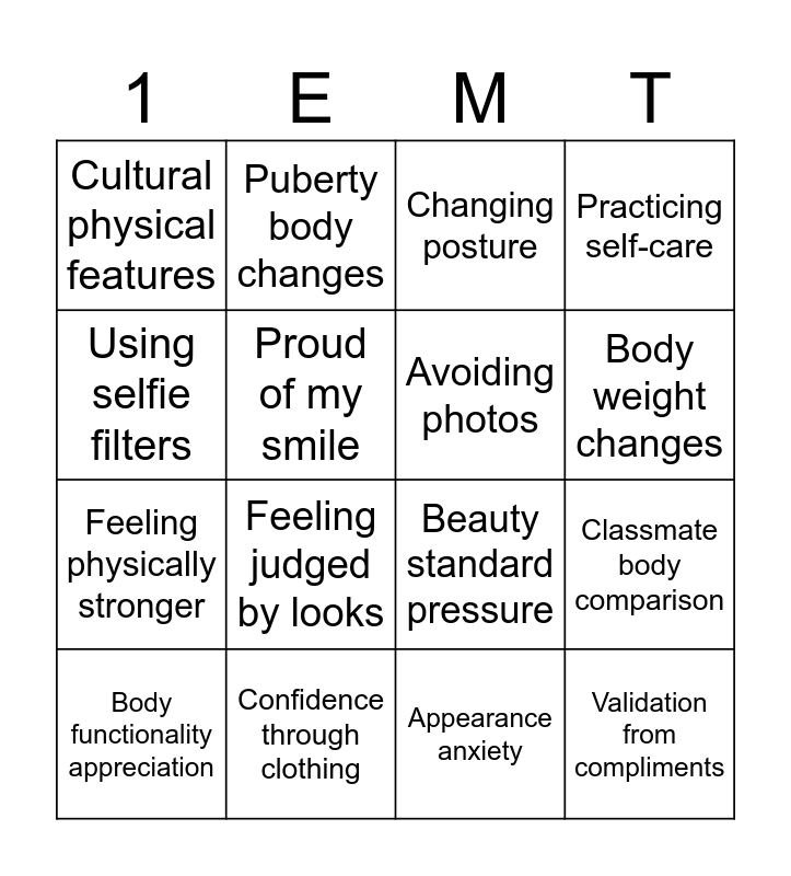 This bingo card has 24 words: Social media comparison, Compliment boosts mood, Body weight changes, Pre-event skin breakout, Using selfie filters, Cultural physical features, Proud of my smile, Puberty body changes, Confidence through clothing, Experiencing body shaming, Feeling physically stronger, Beauty standard pressure, Inherited family traits, “You look like…”, Avoiding photos, Post-haircut confidence, Appearance anxiety, Changing posture, Feeling judged by looks, Classmate body comparison, Body functionality appreciation, Validation from compliments, Practicing self-care and Noticing stretch marks.