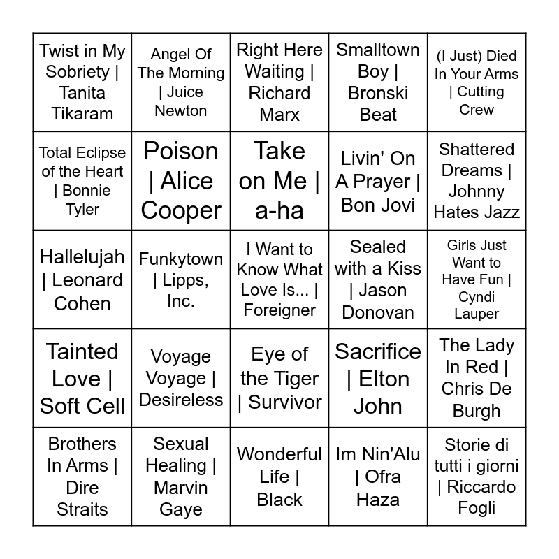 This bingo card has 89 words: Free!, Don't Worry Be Happy | Bobby McFerrin, Eye of the Tiger | Survivor, Every Breath You Take | The Police, Careless Whisper | George Michael, Bamboleo | Gipsy Kings, Joe le taxi | Vanessa Paradis, Stop| Sam Brown, Pete Brown, L'italiano | Toto Cutugno, Super Freak | Rick James, Woman In Love | Barbra Streisand, Is This Love | Whitesnake, The Lady In Red | Chris De Burgh, Girls Just Want to Have Fun | Cyndi Lauper, Lambada | Kaoma, Take on Me | a-ha, Le vent, le cri | Ennio Morricone, Pump Up The Jam | Technotronic, Felly, I Just Called To Say I Love You | Stevie Wonder, Englishman In New York | Sting, Africa | Toto, La Isla Bonita | Madonna, Wonderful Life | Black, In The Army Now | Status Quo, Hallelujah | Leonard Cohen, Sexual Healing | Marvin Gaye, Golden Brown | The Stranglers, Call Me | Blondie, Forever Young | Alphaville, Never Gonna Give You Up | Rick Astley, Smalltown Boy | Bronski Beat, Funkytown | Lipps, Inc., Holding Out For A Hero | Bonnie Tyler, Twist in My Sobriety | Tanita Tikaram, RUNNING UP THAT HILL | Ourania, Right Here Waiting | Richard Marx, Total Eclipse of the Heart | Bonnie Tyler, Take My Breath Away | Berlin, Shattered Dreams | Johnny Hates Jazz, Brothers In Arms | Dire Straits, Tainted Love | Soft Cell, The Winner Takes It All | ABBA, I'm So Excited | The Pointer Sisters, Last Christmas | Wham!, Sacrifice | Elton John, Sealed with a Kiss | Jason Donovan, Sunshine Reggae | Laid Back, La Bamba | Los Lobos, Saving All My Love for You | Whitney Houston, Angel Of The Morning | Juice Newton, Live Is Life | Opus, Hello | Lionel Richie, Bette Davis Eyes | Kim Carnes, It's Raining Men | The Weather Girls, You're a Woman | Bad Boys Blue, Touch By Touch | Joy, I've Seen That Face Before | Grace Jones, Nostalgie | Dalida, Ladies Night | Kool & The Gang, Crockett's Theme | Jan Hammer, Under Pressure | Queen, David Bowie, Abracadabra | Steve Miller Band, Tainted Love | Soft Cell, Karma Chameleon | Culture Club, Hunting High and Low | a-ha, It Must Have Been Love | Edward Miller & His Orchestra, Lily Was Here | Candy Dulfer, Fame | Irene Cara, Self Control | Laura Branigan, Voyage Voyage | Desireless, I Want to Know What Love Is... | Foreigner, Out of Touch | Daryl Hall & John Oates, Nothing's Gonna Change My Love For You | Glenn Medeiros, Livin' On A Prayer | Bon Jovi, Poison | Alice Cooper, Im Nin'Alu | Ofra Haza, Moonlight Shadow | Mike Oldfield, Head Over Heels | ABBA, True | Spandau Ballet, Storie di tutti i giorni | Riccardo Fogli, (I Just) Died In Your Arms | Cutting Crew, Do You Really Want To Hurt Me | Culture Club, Money For Nothing | Dire Straits, Chariots Of Fire | Vangelis Papathanassiou, Vangelis, Cause You Are Young | C.C. Catch, Eyes Without A Face | Billy Idol, Endless Love | Lionel Richie, Diana Ross, Black Velvet | Alannah Myles and Maniac | Michael Sembello.