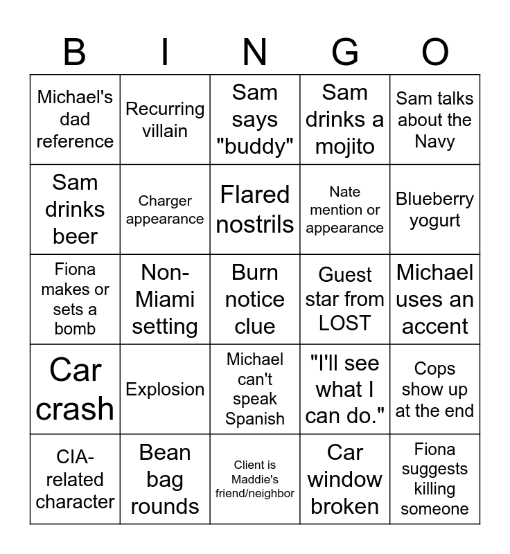This bingo card has 25 words: Explosion, Client is Maddie's friend/neighbor, Flared nostrils, CIA-related character, Sam talks about the Navy, Michael's dad reference, Sam drinks beer, Recurring villain, Guest star from LOST, Michael can't speak Spanish, Nate mention or appearance, Fiona makes or sets a bomb, "I'll see what I can do.", Cops show up at the end, Charger appearance, Fiona suggests killing someone, Michael uses an accent, Sam says "buddy", Blueberry yogurt, Non-Miami setting, Burn notice clue, Bean bag rounds, Car crash, Sam drinks a mojito and Car window broken.