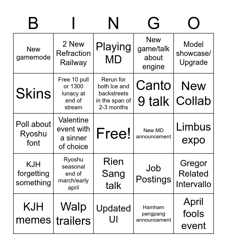 This bingo card has a free space and 24 words: Ryoshu seasonal end of march/early april, Walp trailers, Rerun for both lce and backstreets in the span of 2-3 months, KJH memes, Model showcase/ Upgrade, New gamemode, Skins, 2 New Refraction Railway, New MD announcement, Rien Sang talk, Canto 9 talk, Poll about Ryoshu font, Job Postings, Gregor Related Intervallo, Free 10 pull or 1300 lunacy at end of stream, Hamham pangpang announcement, Limbus expo, Playing MD, New Collab, Valentine event with a sinner of choice, April fools event, KJH forgetting something, New game/talk about engine and Updated UI.