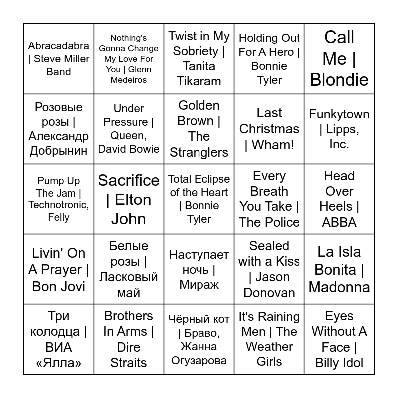 This bingo card has 109 words: Don't Worry Be Happy | Bobby McFerrin, Eye of the Tiger | Survivor, Every Breath You Take | The Police, Careless Whisper | George Michael, Bamboleo | Gipsy Kings, Joe le taxi | Vanessa Paradis, Stop| Sam Brown, Pete Brown, L'italiano | Toto Cutugno, Super Freak | Rick James, Woman In Love | Barbra Streisand, Is This Love | Whitesnake, The Lady In Red | Chris De Burgh, Girls Just Want to Have Fun | Cyndi Lauper, Lambada | Kaoma, Take on Me | a-ha, Le vent, le cri | Ennio Morricone, Pump Up The Jam | Technotronic, Felly, I Just Called To Say I Love You | Stevie Wonder, Englishman In New York | Sting, Africa | Toto, La Isla Bonita | Madonna, Wonderful Life | Black, In The Army Now | Status Quo, Hallelujah | Leonard Cohen, Sexual Healing | Marvin Gaye, Golden Brown | The Stranglers, Call Me | Blondie, Forever Young | Alphaville, Never Gonna Give You Up | Rick Astley, Smalltown Boy | Bronski Beat, Funkytown | Lipps, Inc., Holding Out For A Hero | Bonnie Tyler, Twist in My Sobriety | Tanita Tikaram, RUNNING UP THAT HILL | Ourania, Right Here Waiting | Richard Marx, Total Eclipse of the Heart | Bonnie Tyler, Take My Breath Away | Berlin, Shattered Dreams | Johnny Hates Jazz, Brothers In Arms | Dire Straits, Tainted Love | Soft Cell, The Winner Takes It All | ABBA, I'm So Excited | The Pointer Sisters, Last Christmas | Wham!, Sacrifice | Elton John, Sealed with a Kiss | Jason Donovan, Sunshine Reggae | Laid Back, La Bamba | Los Lobos, Saving All My Love for You | Whitney Houston, Angel Of The Morning | Juice Newton, Live Is Life | Opus, Hello | Lionel Richie, Bette Davis Eyes | Kim Carnes, It's Raining Men | The Weather Girls, You're a Woman | Bad Boys Blue, Touch By Touch | Joy, I've Seen That Face Before | Grace Jones, Nostalgie | Dalida, Ladies Night | Kool & The Gang, Crockett's Theme | Jan Hammer, Under Pressure | Queen, David Bowie, Abracadabra | Steve Miller Band, Tainted Love | Soft Cell, Karma Chameleon | Culture Club, Hunting High and Low | a-ha, It Must Have Been Love | Edward Miller & His Orchestra, Lily Was Here | Candy Dulfer, Fame | Irene Cara, Self Control | Laura Branigan, Voyage Voyage | Desireless, I Want to Know What Love Is... | Foreigner, Out of Touch | Daryl Hall & John Oates, Nothing's Gonna Change My Love For You | Glenn Medeiros, Livin' On A Prayer | Bon Jovi, Poison | Alice Cooper, Im Nin'Alu | Ofra Haza, Moonlight Shadow | Mike Oldfield, Head Over Heels | ABBA, True | Spandau Ballet, Storie di tutti i giorni | Riccardo Fogli, (I Just) Died In Your Arms | Cutting Crew, Do You Really Want To Hurt Me | Culture Club, Money For Nothing | Dire Straits, Chariots Of Fire | Vangelis Papathanassiou, Vangelis, Cause You Are Young | C.C. Catch, Eyes Without A Face | Billy Idol, Endless Love | Lionel Richie, Diana Ross, Black Velvet | Alannah Myles, Maniac | Michael Sembello, Розовые розы | Александр Добрынин, Кто тебе сказал | ВИА «Поющие сердца», Ах, какая женщина | Фристайл, Белые розы | Ласковый май, Чао, бамбино | Кар-Мэн, Всё, что в жизни есть у меня | Самоцветы, Белая ночь | Форум, Моя любовь на пятом этаже | Секрет, Сто друзей | Алла Пугачёва, Ночное рандеву | Крис Кельми, Чёрный кот | Браво, Жанна Огузарова, Зеленоглазое такси | Михаил Боярский, Верю я | Браво, Комарово | Игорь Скляр, Три колодца | ВИА «Ялла», Наступает ночь | Мираж, Миллион алых роз | Алла Пугачёва, Russian Girls | Комбинация, Музыка нас связала | Мираж, Трава у дома | Земляне and Звёзды нас ждут | Мираж.