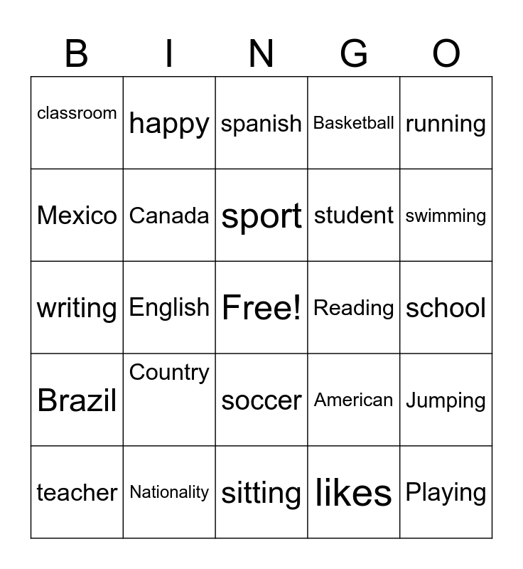 This bingo card has a free space and 24 words: Country, Nationality, sport, teacher, running, classroom, Mexico, happy, Reading, soccer, student, writing, American, Jumping, Canada, likes, school, spanish, swimming, English, Playing, Brazil, Basketball and sitting.