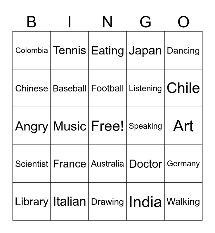 This bingo card has a free space and 24 words: France, Italian, Football, Library, Dancing, Colombia, Chinese, Tennis, Speaking, Australia, Listening, Angry, Doctor, Germany, Baseball, India, Art, Eating, Chile, Music, Walking, Scientist, Japan and Drawing.