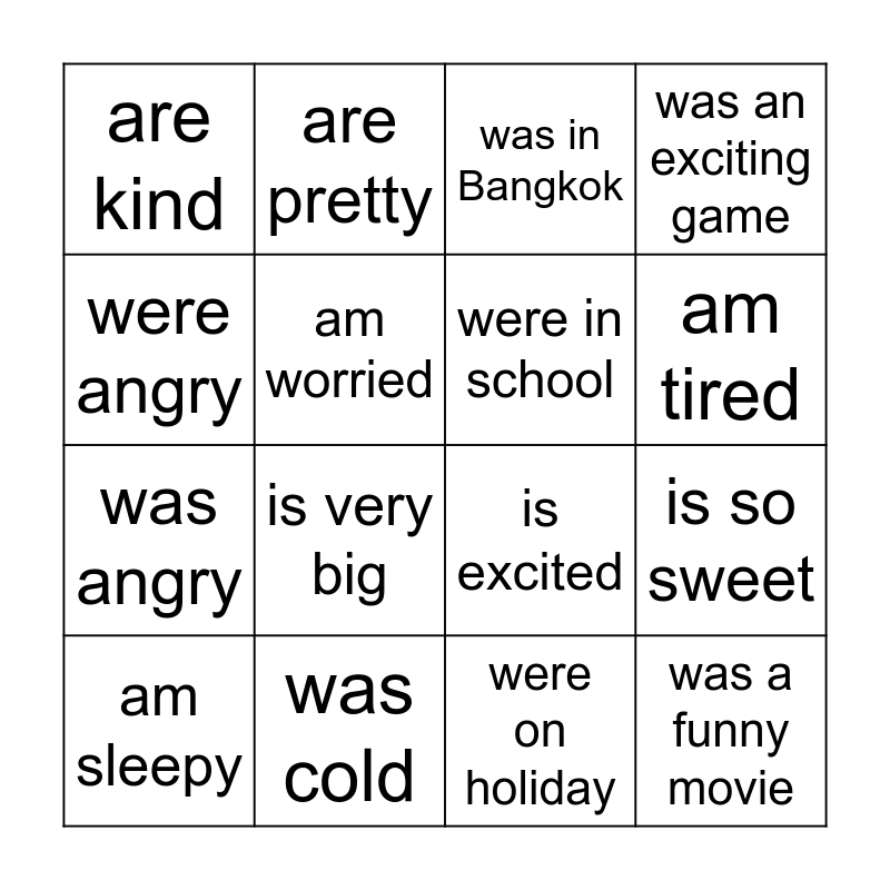 This bingo card has 24 words: is small, was funny, am tired, am sad, were angry, are kind, am worried, are pretty, was cold, is scared, was angry, is excited, were happy, was at home, were in school, are on holiday, were on holiday, was in Bangkok, is very big, is so sweet, am sleepy, was a funny movie, was an exciting game and was a boring book.
