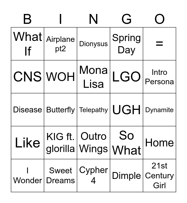 This bingo card has a free space and 24 words: KIG ft. glorilla, Sweet Dreams, Mona Lisa, I Wonder, =, What If, CNS, Airplane pt2, UGH, Outro Wings, LGO, Disease, So What, Home, WOH, Dimple, Dynamite, Dionysus, Intro Persona, Butterfly, 21st Century Girl, Like, Spring Day and Cypher 4.