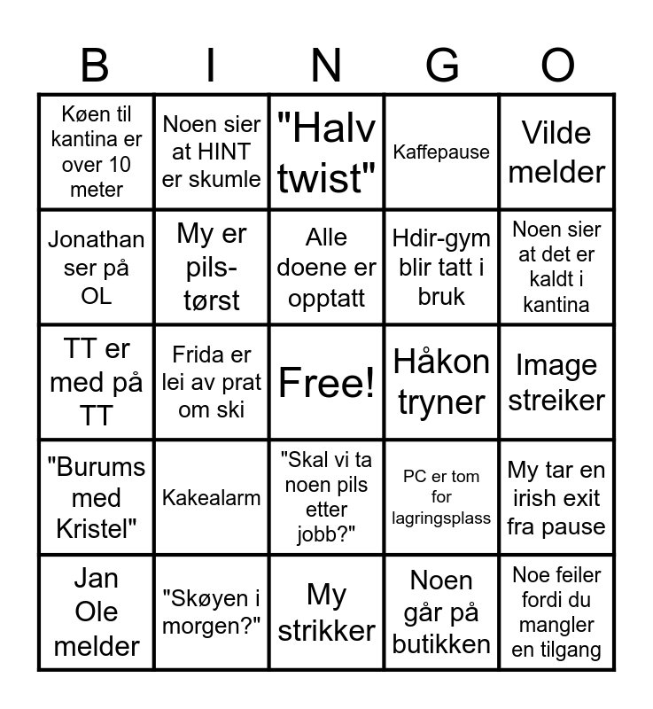 This bingo card has a free space and 37 words: Noen tar på fuktighetskrem, Tosifret antall uleste meldinger i yappechatten, Kaja spør om kaffe, My er pils-tørst, My tar en irish exit fra pause, Kakealarm, Alle doene er opptatt, Vilde gjentar det Frida sa på nordnorsk, Vilde melder, Håkon yapper om ski, Frida er lei av prat om ski, Kaffepause, Noe feiler fordi du mangler en tilgang, Image streiker, Jonathan ser på OL, "Burums med Kristel", Torstein gjorde noe rart i helgen, "Halv twist", "Skal vi ta noen pils etter jobb?", Håkon tryner, Køen til kantina er over 10 meter, Noen sier at det er kaldt i kantina, Jan Ole melder, My strikker, Et møte blir utsatt/avlyst, Noen går på butikken, Noen sier at HINT er skumle, Det er kaos i DAP, Frontend / design blir glemt, Terje sender en gif, Torstein slår ut håret, "Skøyen i morgen?", TT er med på TT, Releaser før man kommer på at man glemte noe, PC er tom for lagringsplass, Hdir-gym blir tatt i bruk and HESA får skylden for noe.