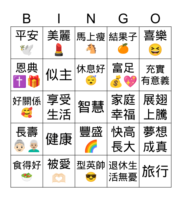 This bingo card has a free space and 24 words: 健康, 被愛 🫶🏻, 休息好 😴, 食得好 🥗, 喜樂 😆, 平安 🕊️, 恩典 ✝️🎁, 美麗 💄, 家庭 幸福, 豐盛 🌈, 富足 💰💖, 好關係 🥰, 快高 長大, 夢想 成真, 似主, 退休生活無憂, 展翅 上騰, 馬上瘦 🐴, 充實 有意義, 享受 生活, 旅行, 長壽 👵🏻👨🏼🦳, 結果子 🍊 and 型英帥 😎.