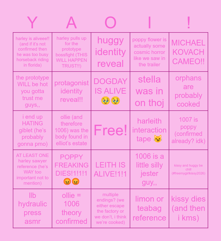 This bingo card has a free space and 24 words: POPPY FREAKING DIES!1!1!1 😡😡, ollie = 1006 theory confirmed, DOGDAY IS ALIVE 🥹🥹, llb hydraulic press asmr, MICHAEL KOVACH CAMEO!!, harley is aliveee!! (and if it’s not confirmed then he was too busy horseback riding in florida), the prototype WILL be hot you gotta trust me guys,,, harley pulls up for the prototype bossfight (THIS WILL HAPPEN TRUST!!), harleith interaction tape 😼, LEITH IS ALIVE!1!1, stella was in on thoj, i end up HATING giblet (he’s probably gonna pmo), 1006 is a little silly jester guy,,, kissy and huggy be chill (#freemygirlkissy2026), protagonist identity reveal!!, limon or teabag reference, 1007 is poppy (confirmed already? idk), huggy identity reveal, orphans are probably cooked, ollie (and therefore 1006) was the body found in elliot’s estate, kissy dies (and then i kms), AT LEAST ONE harley sawyer reference (he’s WAY too important not to mention), poppy flower is actually some cosmic horror like we saw in the trailer and multiple endings? (we either escape the factory or we don’t, i think we’re cooked).