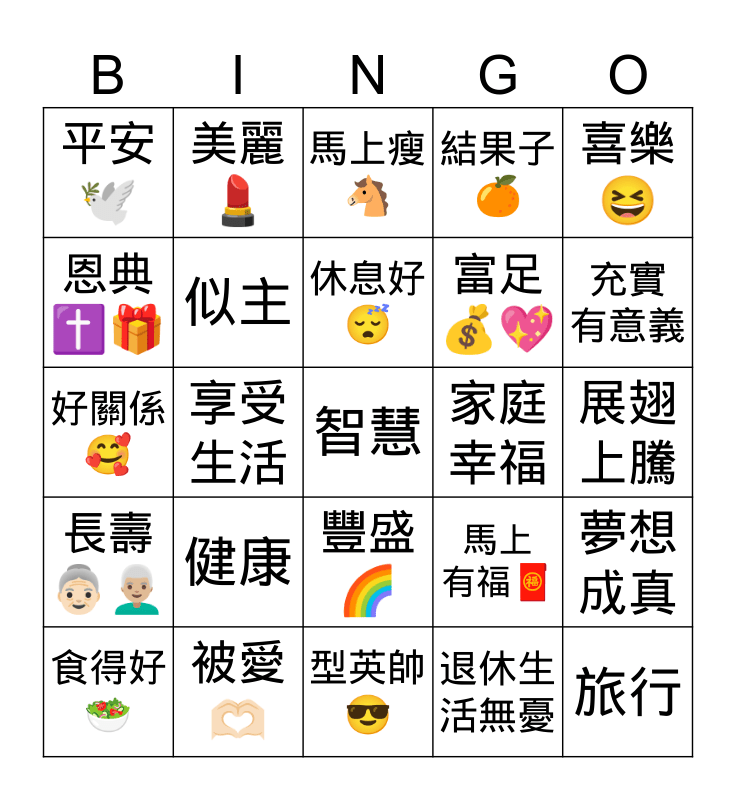 This bingo card has a free space and 24 words: 健康, 被愛 🫶🏻, 休息好 😴, 食得好 🥗, 喜樂 😆, 平安 🕊️, 恩典 ✝️🎁, 美麗 💄, 家庭 幸福, 豐盛 🌈, 富足 💰💖, 好關係 🥰, 馬上 有福🧧, 夢想 成真, 似主, 退休生活無憂, 展翅 上騰, 馬上瘦 🐴, 充實 有意義, 享受 生活, 旅行, 長壽 👵🏻👨🏼🦳, 結果子 🍊 and 型英帥 😎.