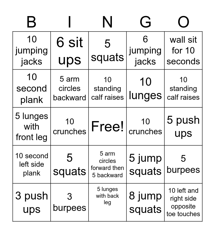 This bingo card has a free space and 24 words: 5 squats, 3 burpees, 10 standing calf raises, 3 push ups, wall sit for 10 seconds, 10 jumping jacks, 10 second plank, 6 sit ups, 10 crunches, 5 arm circles forward then 5 backward, 10 lunges, 5 lunges with front leg, 5 jump squats, 5 burpees, 5 arm circles backward, 8 jump squats, 5 push ups, 5 squats, 10 standing calf raises, 10 crunches, 10 left and right side opposite toe touches, 10 second left side plank, 6 jumping jacks and 5 lunges with back leg.