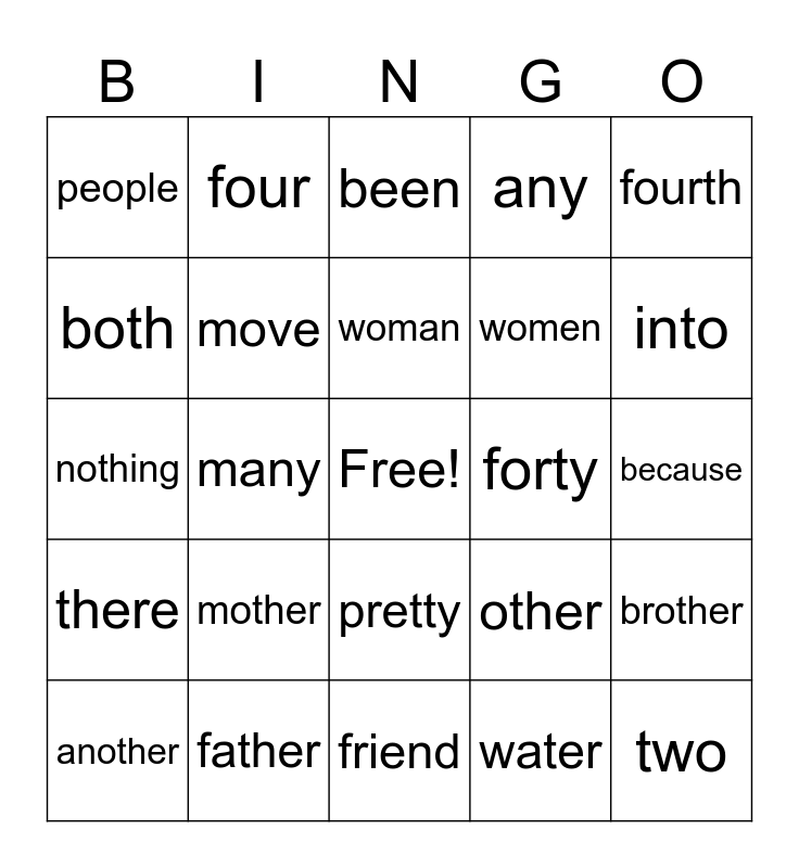 This bingo card has a free space and 24 words: mother, father, woman, another, fourth, people, both, four, forty, pretty, women, nothing, other, brother, move, water, because, been, into, many, two, there, any and friend.