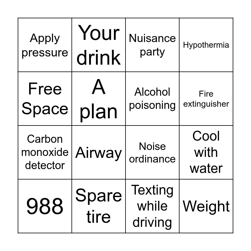 This bingo card has 16 words: Spare tire, Cool with water, Nuisance party, Apply pressure, Carbon monoxide detector, Your drink, Noise ordinance, Texting while driving, Free Space, A plan, 988, Hypothermia, Airway, Fire extinguisher, Alcohol poisoning and Weight.