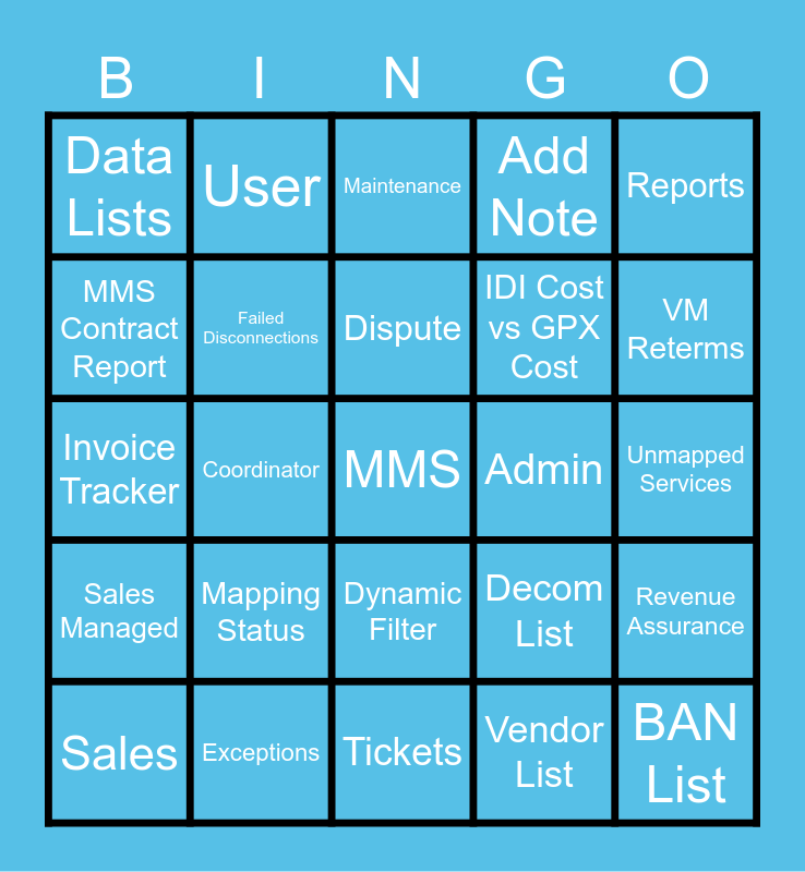 This bingo card has a free space and 29 words: Reports, Exceptions, Maintenance, Analysis, Reports, Data Lists, Failed Disconnections, Dispute, Admin, Revenue Assurance, Sales, Coordinator, Vendor List, BAN List, Invoice Tracker, Rate Increase, Tickets, Decom List, VM Reterms, Sales Managed, Mapping Status, Margin Analysis - Operations, IDI Cost vs GPX Cost, Unmapped Services, MMS Contract Report, User, Dynamic Filter, Add Note and Color Scheme.