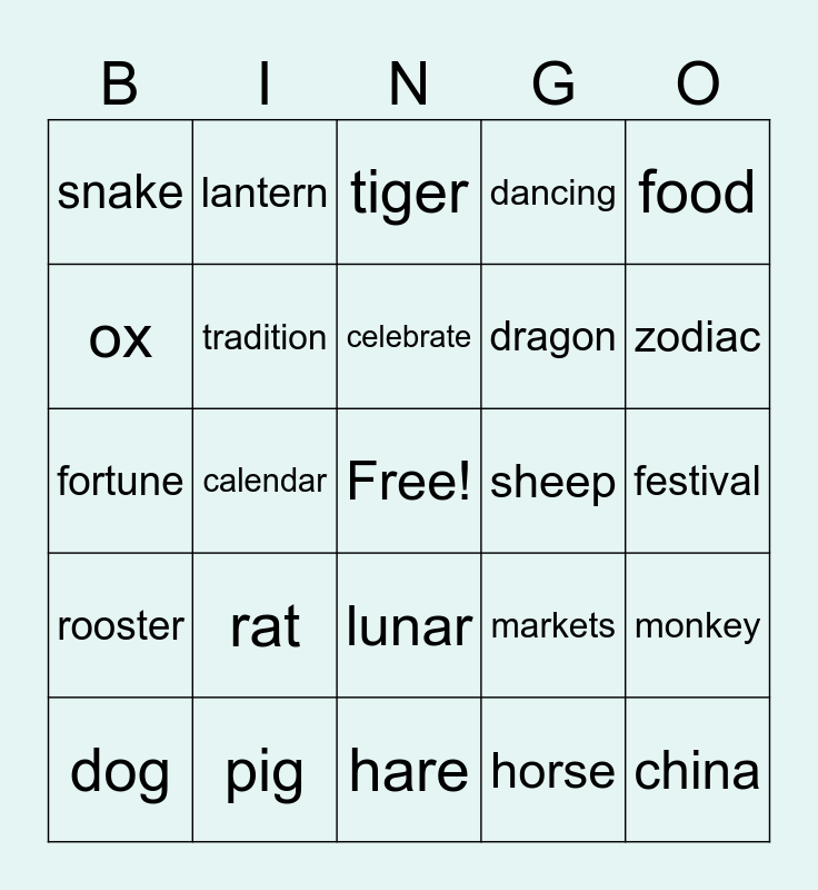 This bingo card has a free space and 24 words: rat, pig, celebrate, dog, food, snake, ox, lantern, sheep, lunar, dragon, fortune, markets, monkey, tradition, horse, festival, tiger, zodiac, calendar, china, rooster, dancing and hare.