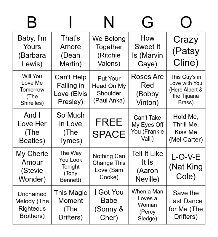 This bingo card has a free space and 24 words: The Way You Look Tonight (Tony Bennett), This Magic Moment (The Drifters), Put Your Head On My Shoulder (Paul Anka), Unchained Melody (The Righteous Brothers), Crazy (Patsy Cline), Baby, I'm Yours (Barbara Lewis), Will You Love Me Tomorrow (The Shirelles), That's Amore (Dean Martin), Can't Take My Eyes Off You (Frankie Valli), Nothing Can Change This Love (Sam Cooke), Roses Are Red (Bobby Vinton), And I Love Her (The Beatles), Tell It Like It Is (Aaron Neville), L-O-V-E (Nat King Cole), Can't Help Falling in Love (Elvis Presley), When a Man Loves a Woman (Percy Sledge), Hold Me, Thrill Me, Kiss Me (Mel Carter), We Belong Together (Ritchie Valens), This Guy's in Love with You (Herb Alpert & the Tijuana Brass), So Much in Love (The Tymes), Save the Last Dance for Me (The Drifters), My Cherie Amour (Stevie Wonder), How Sweet It Is (Marvin Gaye) and I Got You Babe (Sonny & Cher).