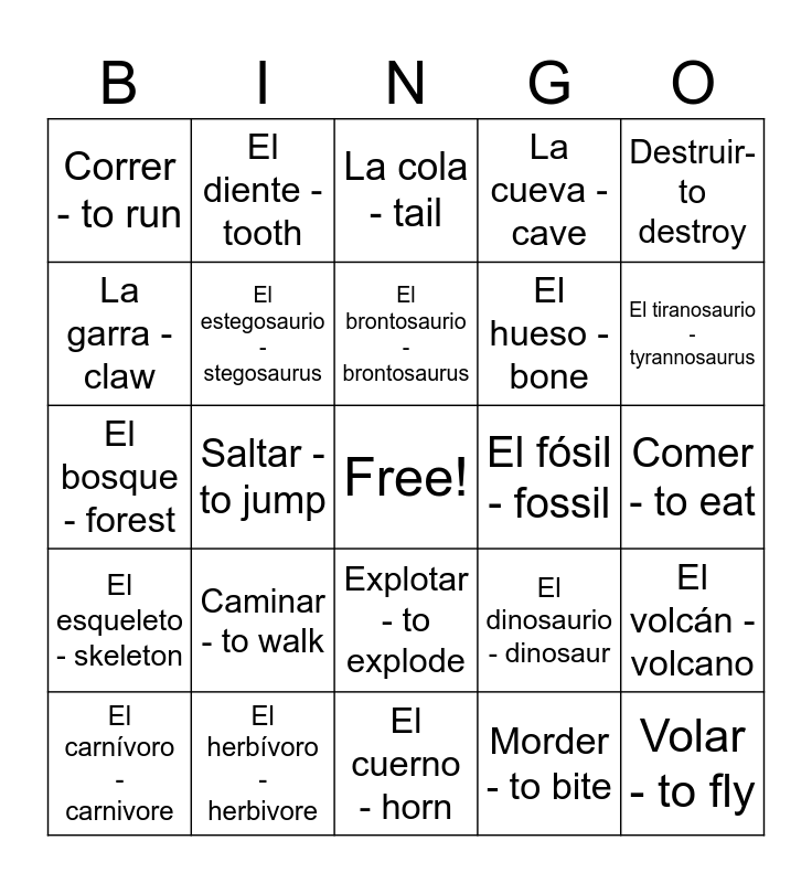 This bingo card has a free space and 27 words: El dinosaurio - dinosaur, El huevo - egg, El hueso - bone, El cuerno - horn, La garra - claw, La cola - tail, El diente - tooth, El esqueleto - skeleton, El fósil - fossil, El volcán - volcano, El bosque - forest, La cueva - cave, El carnívoro - carnivore, El herbívoro - herbivore, El tiranosaurio - tyrannosaurus, El velociraptor - velociraptor, El estegosaurio - stegosaurus, El brontosaurio - brontosaurus, Caminar - to walk, Correr - to run, Comer - to eat, Morder - to bite, Saltar - to jump, Volar - to fly, Explotar - to explode, Destruir- to destroy and Cavar - to dig.
