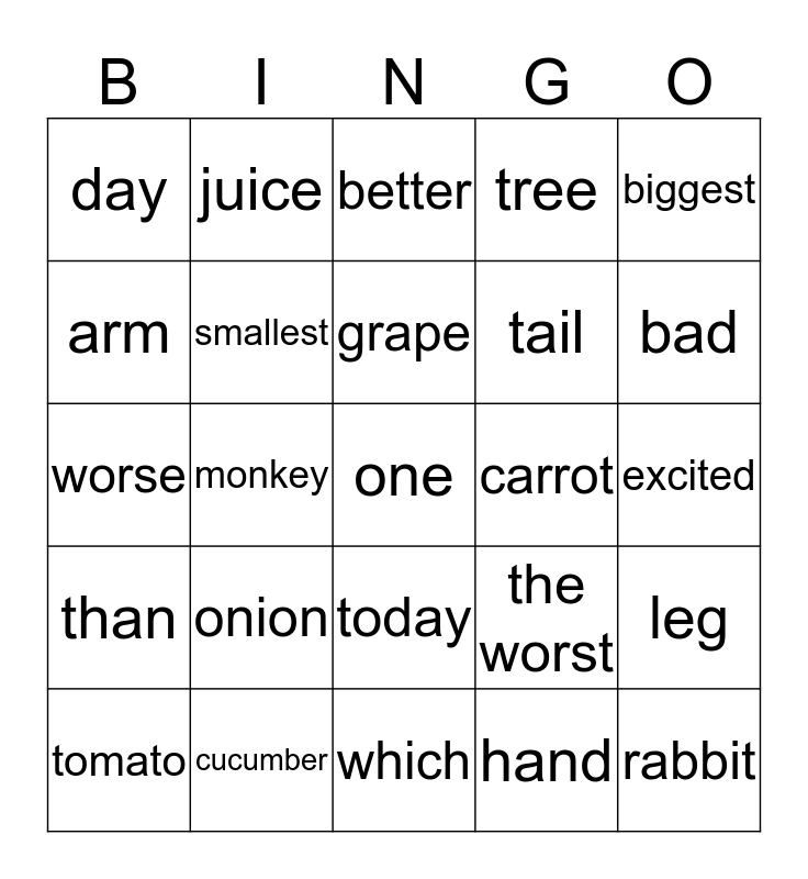 This bingo card has 33 words: rabbit, smaller, monkey, elephant, than, smallest, biggest, tomato, juice, good, grape, better, orange, the best, carrot, bad, cucumber, worse, onion, the worst, today, the best, day, excited, which, one, tree, tail, arm, leg, nose, hand and ear.