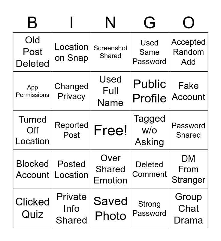 This bingo card has a free space and 24 words: Posted Location, Private Info Shared, Used Full Name, Clicked Quiz, Accepted Random Add, Old Post Deleted, App Permissions, Location on Snap, Tagged w/o Asking, Over Shared Emotion, Public Profile, Turned Off Location, Deleted Comment, DM From Stranger, Changed Privacy, Strong Password, Password Shared, Screenshot Shared, Fake Account, Reported Post, Group Chat Drama, Blocked Account, Used Same Password and Saved Photo.