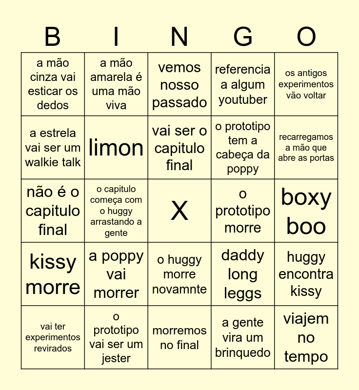 This bingo card has a free space and 24 words: a poppy vai morrer, o prototipo vai ser um jester, vai ser o capitulo final, vai ter experimentos revirados, os antigos experimentos vão voltar, a mão cinza vai esticar os dedos, a estrela vai ser um walkie talk, a mão amarela é uma mão viva, o prototipo morre, o huggy morre novamnte, o prototipo tem a cabeça da poppy, não é o capitulo final, daddy long leggs, huggy encontra kissy, limon, a gente vira um brinquedo, boxy boo, vemos nosso passado, recarregamos a mão que abre as portas, o capitulo começa com o huggy arrastando a gente, viajem no tempo, kissy morre, referencia a algum youtuber and morremos no final.