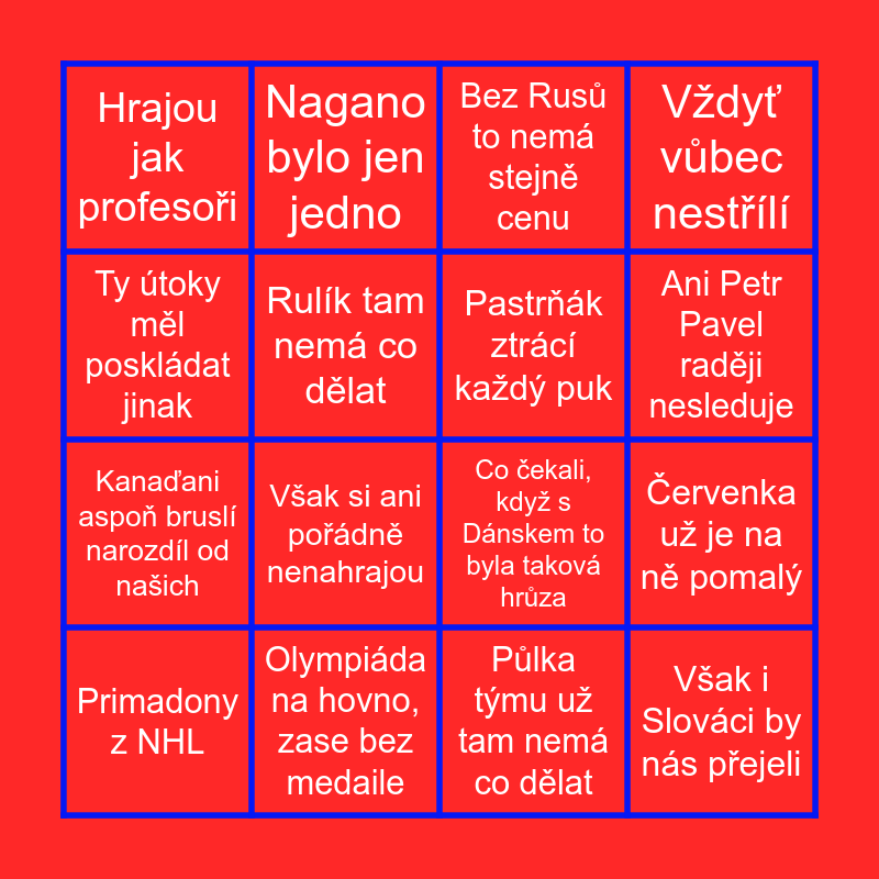 This bingo card has 16 words: Olympiáda na hovno, zase bez medaile, Červenka už je na ně pomalý, Bez Rusů to nemá stejně cenu, Hrajou jak profesoři, Kanaďani aspoň bruslí narozdíl od našich, Nagano bylo jen jedno, Co čekali, když s Dánskem to byla taková hrůza, Půlka týmu už tam nemá co dělat, Ty útoky měl poskládat jinak, Rulík tam nemá co dělat, Primadony z NHL, Vždyť vůbec nestřílí, Však si ani pořádně nenahrajou, Ani Petr Pavel raději nesleduje, Pastrňák ztrácí každý puk and Však i Slováci by nás přejeli.