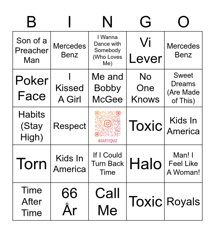 ⚠ This card has duplicate items: Killer Queen (2), Royals (2), Halo (2), I Wanna Dance with Somebody (Who Loves Me) (2), Bring Me To Life (2), Hello (2), All By Myself (2), Rolling in the Deep (2), Wrecking Ball (2), Rehab (2), Son of a Preacher Man (3), (You Make Me Feel Like) A Natural Woman (2), If I Could Turn Back Time (2), What's Love Got To Do WIth It (2), Mercedes Benz (2), Don't Speak (2), Just A Girl (2), Don't Cry for Me Argentina (2), Torn (2), Feeling Good (2), No One Knows (2), Poker Face (2), Rich Girl (2), Man! I Feel Like A Woman! (2), Me and Bobby McGee (2), I Kissed A Girl (2), Wannabe (2), Believe (2), Call Me (2), Toxic (2), Roar (2), Girl on Fire (2), Respect (2), Habits (Stay High) (2), Listen To Your Heart (2), Holding Out for a Hero (2), Heaven Is A Place On Earth (2), Kids In America (2), Time After Time (2), Sweet Dreams (Are Made of This) (2), Vi Lever (2), 66 År (2), Edge of Seventeen (2), Zombie (2), Celebrity Skin (2), Piece of My Heart (2), You Oughta Know (2), Down By The Water (2)
