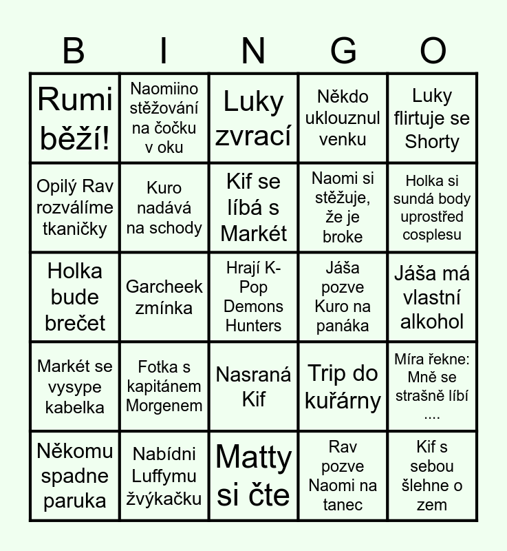 This bingo card has 25 words: Fotka s kapitánem Morgenem, Matty si čte, Kif se líbá s Markét, Někomu spadne paruka, Luky flirtuje se Shorty, Rumi běží!, Opilý Rav rozválíme tkaničky, Naomiino stěžování na čočku v oku, Jáša pozve Kuro na panáka, Nasraná Kif, Naomi si stěžuje, že je broke, Holka bude brečet, Trip do kuřárny, Míra řekne: Mně se strašně líbí ...., Kuro nadává na schody, Kif s sebou šlehne o zem, Jáša má vlastní alkohol, Luky zvrací, Holka si sundá body uprostřed cosplesu, Garcheek zmínka, Hrají K-Pop Demons Hunters, Nabídni Luffymu žvýkačku, Markét se vysype kabelka, Někdo uklouznul venku and Rav pozve Naomi na tanec.