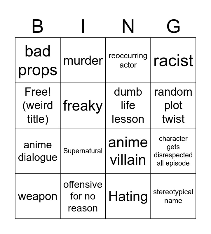 This bingo card has 16 words: offensive for no reason, character gets disrespected all episode, reoccurring actor, bad props, anime dialogue, murder, anime villain, Hating, Free! (weird title), freaky, weapon, racist, Supernatural, random plot twist, dumb life lesson and stereotypical name.
