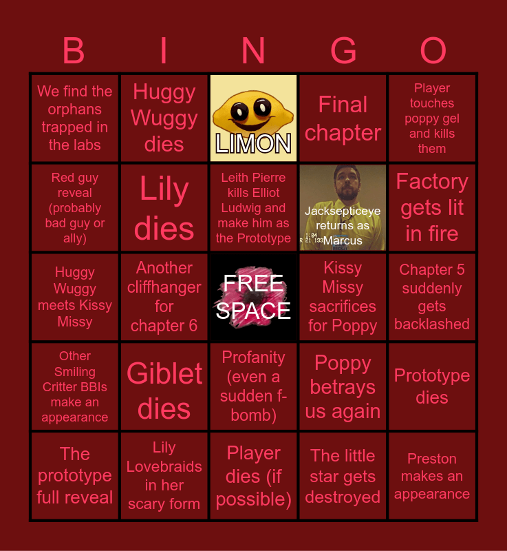 This bingo card has 2 images, a free space and 24 words: Giblet dies, Lily Lovebraids in her scary form, Leith Pierre kills Elliot Ludwig and make him as the Prototype, The prototype full reveal, Player touches poppy gel and kills them, We find the orphans trapped in the labs, Red guy reveal (probably bad guy or ally), Huggy Wuggy dies, Kissy Missy sacrifices for Poppy, Profanity (even a sudden f-bomb), Jacksepticeye returns as Marcus, Huggy Wuggy meets Kissy Missy, Poppy betrays us again, Prototype dies, Lily dies, The little star gets destroyed, Chapter 5 suddenly gets backlashed, LIMON, Factory gets lit in fire, Another cliffhanger for chapter 6, Preston makes an appearance, Other Smiling Critter BBIs make an appearance, Final chapter and Player dies (if possible).