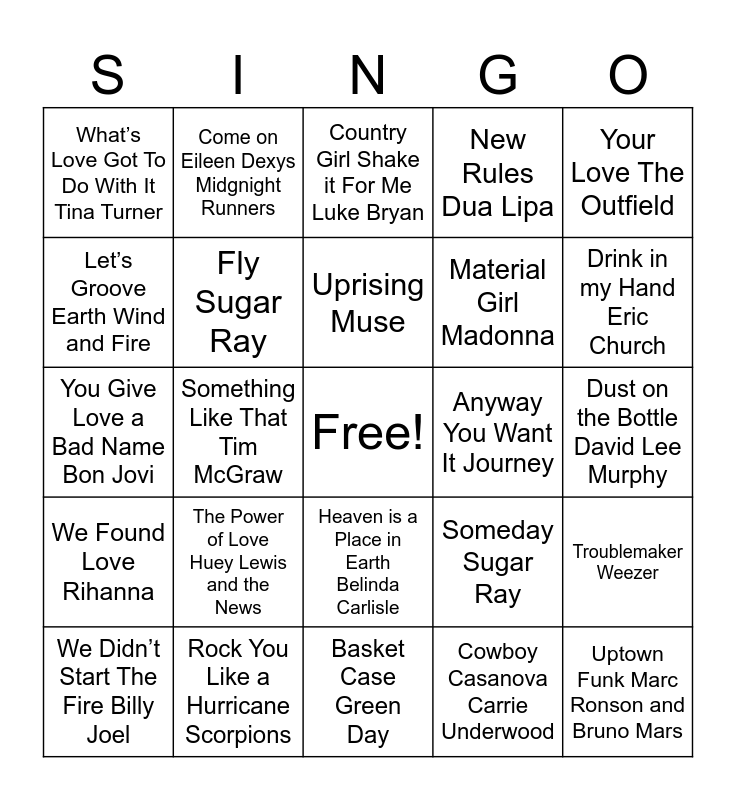 This bingo card has a free space and 24 words: The Power of Love Huey Lewis and the News, Rock You Like a Hurricane Scorpions, Uprising Muse, We Didn’t Start The Fire Billy Joel, Your Love The Outfield, What’s Love Got To Do With It Tina Turner, Let’s Groove Earth Wind and Fire, Come on Eileen Dexys Midgnight Runners, Anyway You Want It Journey, Heaven is a Place in Earth Belinda Carlisle, Material Girl Madonna, You Give Love a Bad Name Bon Jovi, Someday Sugar Ray, Troublemaker Weezer, Fly Sugar Ray, Cowboy Casanova Carrie Underwood, Dust on the Bottle David Lee Murphy, Country Girl Shake it For Me Luke Bryan, Drink in my Hand Eric Church, Something Like That Tim McGraw, Uptown Funk Marc Ronson and Bruno Mars, We Found Love Rihanna, New Rules Dua Lipa and Basket Case Green Day.