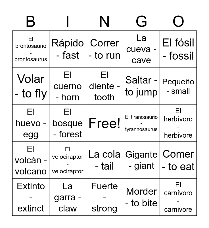 This bingo card has a free space and 40 words: El dinosaurio - dinosaur, El huevo - egg, El hueso - bone, El cuerno - horn, La garra - claw, La cola - tail, El diente - tooth, El esqueleto - skeleton, El fósil - fossil, El volcán - volcano, El bosque - forest, La cueva - cave, El carnívoro - carnivore, El herbívoro - herbivore, El tiranosaurio - tyrannosaurus, El velociraptor - velociraptor, El estegosaurio - stegosaurus, El brontosaurio - brontosaurus, Caminar - to walk, Correr - to run, Comer - to eat, Morder - to bite, Saltar - to jump, Volar - to fly, Explotar - to explode, Destruir- to destroy, Cavar - to dig, Excavar - to excavate, Perseguir - to chase, Atacar - to attack, Romper - to break, Extinto - extinct, Grande - big, Gigante - giant, Pequeño - small, Fuerte - strong, Alto - tall, Bajo - short, Rápido - fast and Lento - slow.