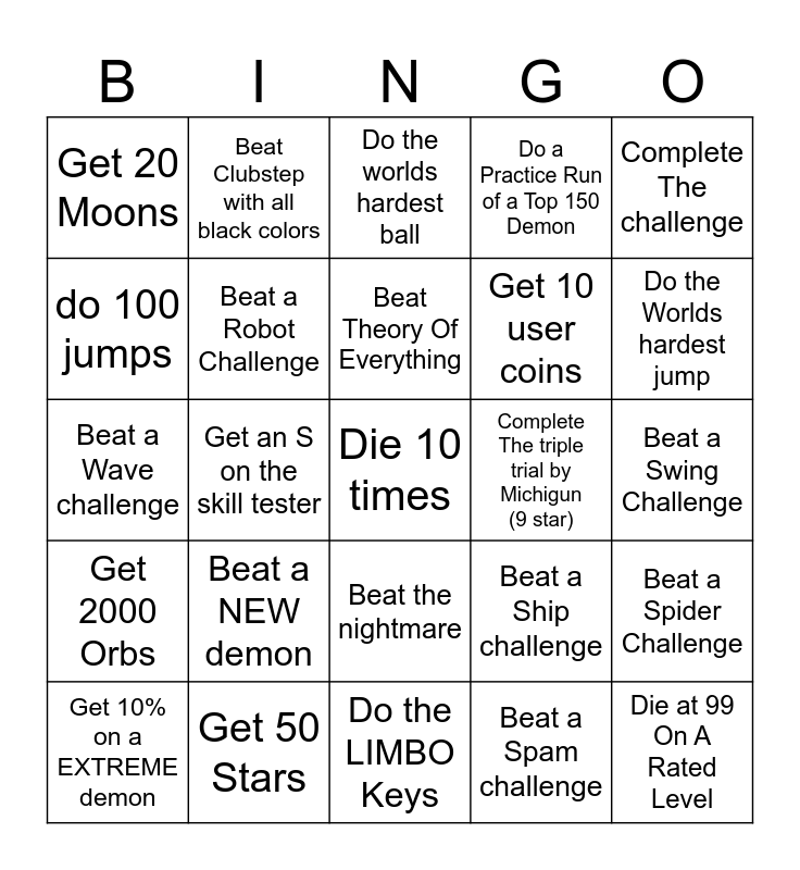 This bingo card has a free space and 24 words: Beat a NEW demon, Get 50 Stars, Beat Theory Of Everything, Get 10% on a EXTREME demon, Complete The challenge, Get 20 Moons, do 100 jumps, Beat Clubstep with all black colors, Complete The triple trial by Michigun (9 star), Beat the nightmare, Get 10 user coins, Beat a Wave challenge, Beat a Ship challenge, Beat a Spider Challenge, Beat a Robot Challenge, Beat a Spam challenge, Beat a Swing Challenge, Do the worlds hardest ball, Do the Worlds hardest jump, Get an S on the skill tester, Die at 99 On A Rated Level, Get 2000 Orbs, Do a Practice Run of a Top 150 Demon and Do the LIMBO Keys.