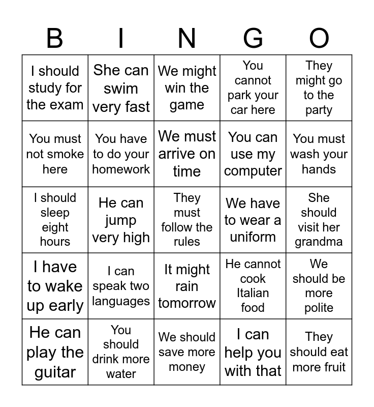 This bingo card has a free space and 24 words: I can speak two languages, You should drink more water, We must arrive on time, He can play the guitar, They might go to the party, I should study for the exam, You must not smoke here, She can swim very fast, We have to wear a uniform, It might rain tomorrow, You can use my computer, I should sleep eight hours, He cannot cook Italian food, We should be more polite, You have to do your homework, I can help you with that, She should visit her grandma, We might win the game, You must wash your hands, He can jump very high, They should eat more fruit, I have to wake up early, You cannot park your car here and We should save more money.