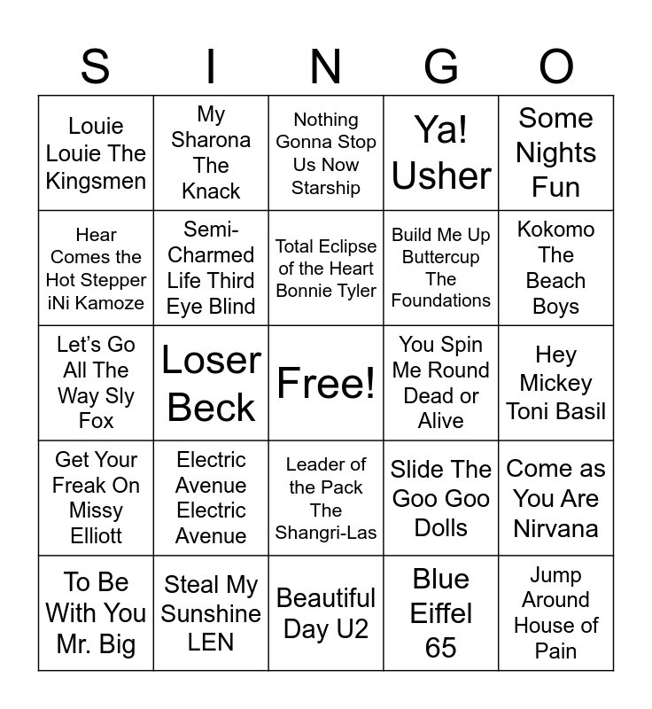 This bingo card has a free space and 24 words: Electric Avenue Electric Avenue, Steal My Sunshine LEN, Total Eclipse of the Heart Bonnie Tyler, To Be With You Mr. Big, Some Nights Fun, Louie Louie The Kingsmen, Hear Comes the Hot Stepper iNi Kamoze, My Sharona The Knack, You Spin Me Round Dead or Alive, Leader of the Pack The Shangri-Las, Build Me Up Buttercup The Foundations, Let’s Go All The Way Sly Fox, Slide The Goo Goo Dolls, Come as You Are Nirvana, Semi-Charmed Life Third Eye Blind, Blue Eiffel 65, Hey Mickey Toni Basil, Nothing Gonna Stop Us Now Starship, Kokomo The Beach Boys, Loser Beck, Jump Around House of Pain, Get Your Freak On Missy Elliott, Ya! Usher and Beautiful Day U2.