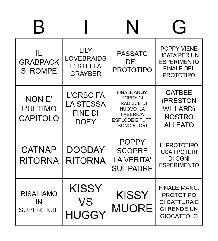 This bingo card has 16 words: KISSY VS HUGGY, IL PROTOTIPO USA I POTERI DI OGNI ESPERIMENTO, PASSATO DEL PROTOTIPO, IL GRABPACK SI ROMPE, CATNAP RITORNA, LILY LOVEBRAIDS E' STELLA GRAYBER, POPPY SCOPRE LA VERITA' SUL PADRE, KISSY MUORE, NON E' L'ULTIMO CAPITOLO, L'ORSO FA LA STESSA FINE DI DOEY, RISALIAMO IN SUPERFICIE, POPPY VIENE USATA PER UN ESPERIMENTO FINALE DEL PROTOTIPO, DOGDAY RITORNA, CATBEE (PRESTON WILLARD) NOSTRO ALLEATO, FINALE ANGY: POPPY CI TRADISCE DI NUOVO, LA FABBRICA ESPLODE E TUTTI SONO FUORI and FINALE MANU: PROTOTIPO CI CATTURA E CI RENDE UN GIOCATTOLO.