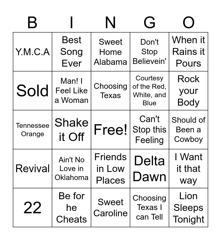 This bingo card has a free space and 30 words: Be for he Cheats, Party in the USA, Shake it Off, Bing Green Tractor, Y.M.C.A, Sweet Home Alabama, Man! I Feel Like a Woman, Friends in Low Places, Can't Stop this Feeling, Sweet Caroline, Should of Been a Cowboy, Lion Sleeps Tonight, Choosing Texas I can Tell, I Never Lie, Rock your Body, That's What I like, Delta Dawn, Revival, Ain't No Love in Oklahoma, When it Rains it Pours, Tennessee Orange, Mama's Broken Heart, Best Song Ever, Courtesy of the Red, White, and Blue, Sold, Don't Stop Believein', I Want it that way, 22, Choosing Texas and Beautiful Things.