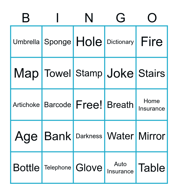This bingo card has a free space and 34 words: Keyboard, Auto Insurance, Candle, Cloud, Age, Towel, Fire, Bottle, Sponge, Needle, Stamp, Hole, Barber, Echo, Breath, Stairs, Telephone, Artichoke, Bank, Water, Darkness, Photo, Umbrella, Home Insurance, Glove, Table, Dictionary, Letter E, Joke, Map, Time, Barcode, Mirror and Seatbelt.