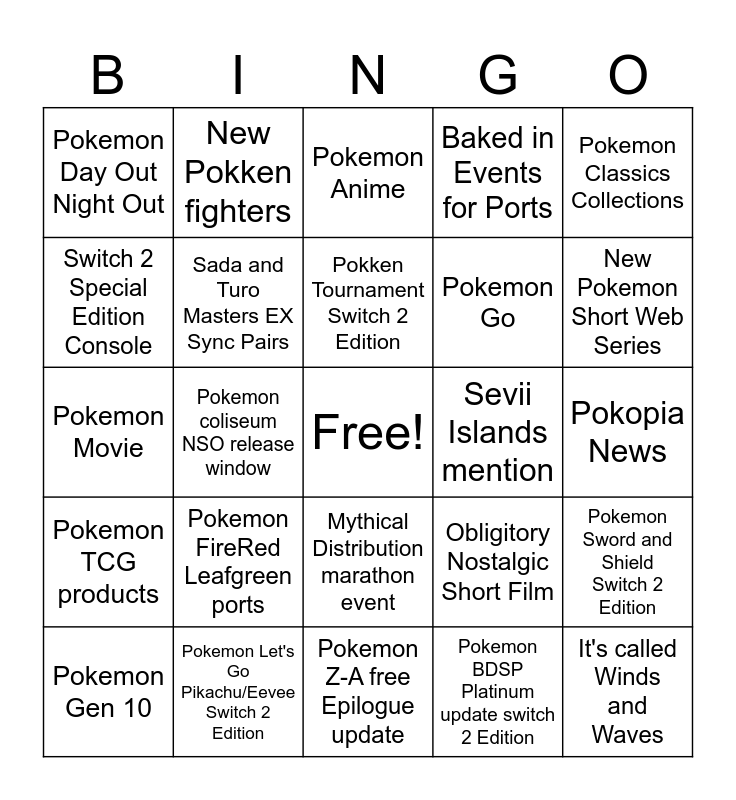 This bingo card has a free space and 24 words: Pokemon FireRed Leafgreen ports, Pokemon Let's Go Pikachu/Eevee Switch 2 Edition, Pokken Tournament Switch 2 Edition, Pokemon Gen 10, Pokemon Classics Collections, Pokemon Day Out Night Out, Switch 2 Special Edition Console, New Pokken fighters, Sevii Islands mention, Mythical Distribution marathon event, Pokemon Go, Pokemon Movie, Obligitory Nostalgic Short Film, Pokemon Sword and Shield Switch 2 Edition, Sada and Turo Masters EX Sync Pairs, Pokemon BDSP Platinum update switch 2 Edition, Pokopia News, Pokemon Anime, New Pokemon Short Web Series, Pokemon coliseum NSO release window, It's called Winds and Waves, Pokemon TCG products, Baked in Events for Ports and Pokemon Z-A free Epilogue update.