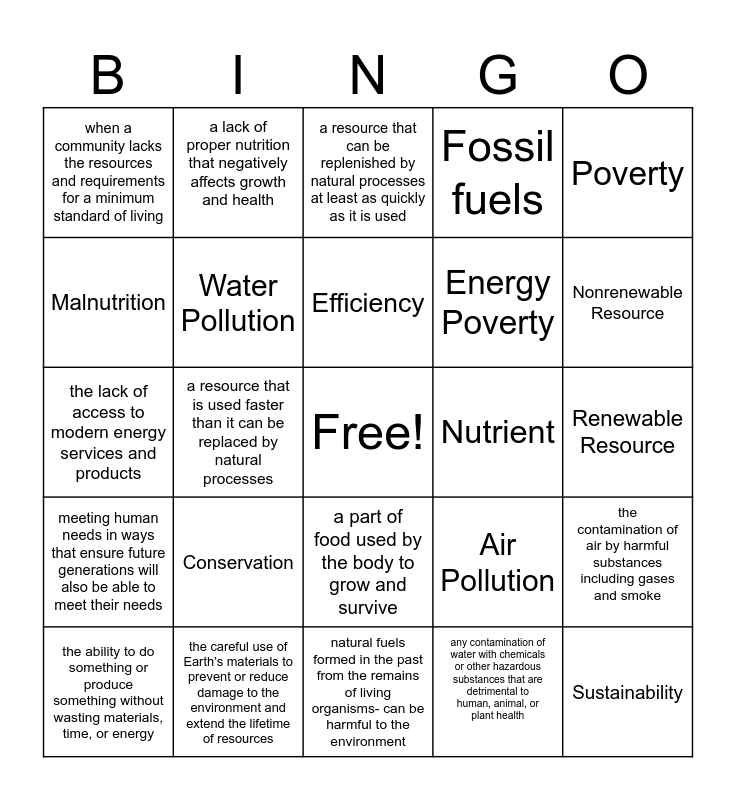 This bingo card has a free space and 24 words: Conservation, the careful use of Earth’s materials to prevent or reduce damage to the environment and extend the lifetime of resources, Efficiency, the ability to do something or produce something without wasting materials, time, or energy, Poverty, when a community lacks the resources and requirements for a minimum standard of living, Malnutrition, a lack of proper nutrition that negatively affects growth and health, Nutrient, a part of food used by the body to grow and survive, Energy Poverty, the lack of access to modern energy services and products, Air Pollution, the contamination of air by harmful substances including gases and smoke, Water Pollution, any contamination of water with chemicals or other hazardous substances that are detrimental to human, animal, or plant health, Renewable Resource, a resource that can be replenished by natural processes at least as quickly as it is used, Nonrenewable Resource, a resource that is used faster than it can be replaced by natural processes, Sustainability, meeting human needs in ways that ensure future generations will also be able to meet their needs, Fossil fuels and natural fuels formed in the past from the remains of living organisms- can be harmful to the environment.