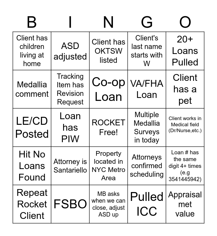 This bingo card has a free space and 24 words: Attorney is Santariello, FSBO, Co-op Loan, Repeat Rocket Client, 20+ Loans Pulled, Client has children living at home, Medallia comment, ASD adjusted, Multiple Medallia Surveys in today, Property located in NYC Metro Area, VA/FHA Loan, LE/CD Posted, Attorneys confirmed scheduling, Loan # has the same digit 4+ times (e.g 3541445942), Tracking Item has Revision Request, Pulled ICC, Client works in Medical field (Dr/Nurse,etc.), Client has OKTSW listed, Client has a pet, Loan has PIW, Appraisal met value, Hit No Loans Found, Client's last name starts with W and MB asks when we can close, adjust ASD up.
