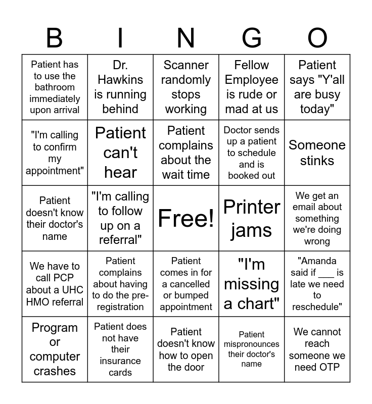 This bingo card has a free space and 24 words: Patient complains about having to do the pre-registration, Patient does not have their insurance cards, Patient complains about the wait time, Program or computer crashes, Patient says "Y'all are busy today", Patient has to use the bathroom immediately upon arrival, "I'm calling to confirm my appointment", Dr. Hawkins is running behind, Printer jams, Patient comes in for a cancelled or bumped appointment, Doctor sends up a patient to schedule and is booked out, Patient doesn't know their doctor's name, "I'm missing a chart", "Amanda said if ___ is late we need to reschedule", Patient can't hear, Patient mispronounces their doctor's name, We get an email about something we're doing wrong, Scanner randomly stops working, Someone stinks, "I'm calling to follow up on a referral", We cannot reach someone we need OTP, We have to call PCP about a UHC HMO referral, Fellow Employee is rude or mad at us and Patient doesn't know how to open the door.