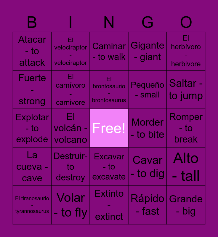 This bingo card has a free space and 33 words: El esqueleto - skeleton, El fósil - fossil, El volcán - volcano, El bosque - forest, La cueva - cave, El carnívoro - carnivore, El herbívoro - herbivore, El tiranosaurio - tyrannosaurus, El velociraptor - velociraptor, El estegosaurio - stegosaurus, El brontosaurio - brontosaurus, Caminar - to walk, Correr - to run, Comer - to eat, Morder - to bite, Saltar - to jump, Volar - to fly, Explotar - to explode, Destruir- to destroy, Cavar - to dig, Excavar - to excavate, Perseguir - to chase, Atacar - to attack, Romper - to break, Extinto - extinct, Grande - big, Gigante - giant, Pequeño - small, Fuerte - strong, Alto - tall, Bajo - short, Rápido - fast and Lento - slow.