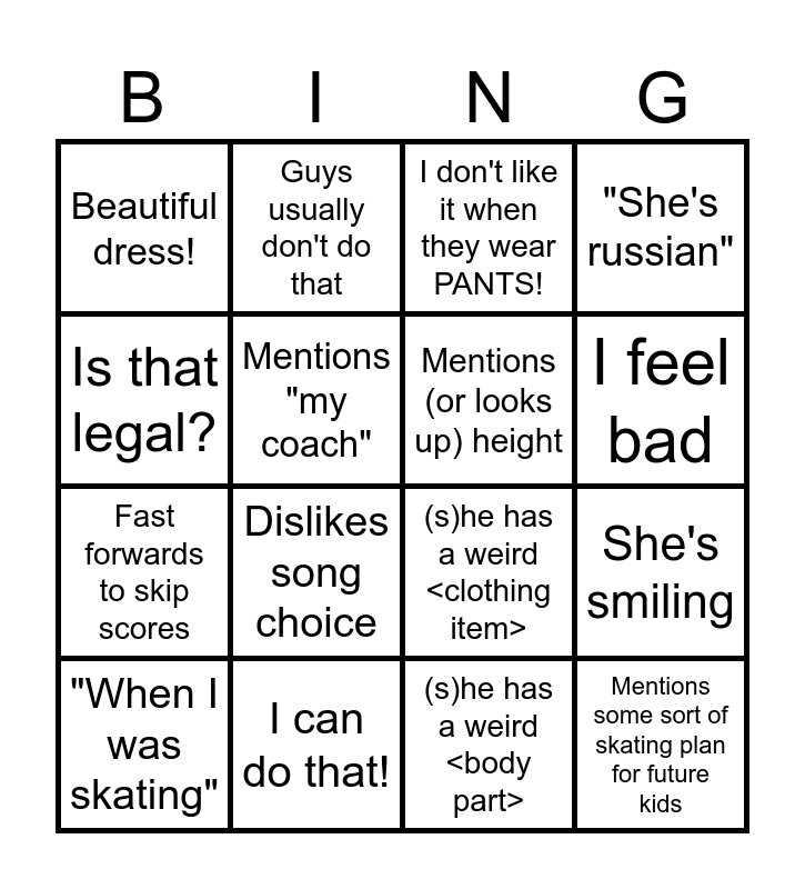 This bingo card has 16 words: I can do that!, She's smiling, I don't like it when they wear PANTS!, Beautiful dress!, Fast forwards to skip scores, Guys usually don't do that, (s)he has a weird <clothing item>, (s)he has a weird <body part>, Is that legal?, Mentions "my coach", "When I was skating", "She's russian", Dislikes song choice, I feel bad, Mentions (or looks up) height and Mentions some sort of skating plan for future kids.